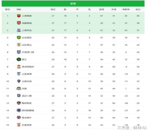 中超积分榜:争冠主动权仍在海港手里,下轮海港生死战决定争冠