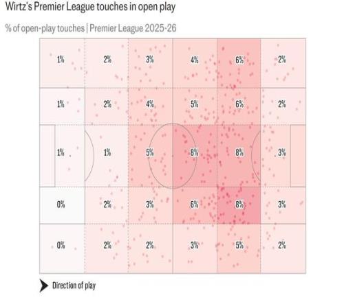 维尔茨被签下是作为利物浦的10号位球员,但上赛季他在勒沃库森的大部分触球发生在左翼(当时他主要司职3-4-2-1阵型中的左路攻击型中场)。上赛季在德甲,他45%的触球发生在左路进攻区域。而本赛季在利物浦,这一比例仅为25%。总体而言,他在利物浦在右路的触球比例(27%)实际上更高。