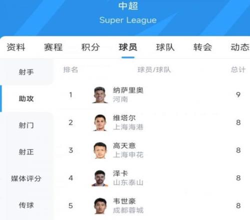 中超第28轮联赛过后,助攻榜第一名竟然还是他。最新的助攻榜上,30岁的巴西中场纳萨里奥以9次助攻排在第一位,而他身后有4名球员贡献8次助攻,紧随其后。在联赛只剩2轮的情况下,纳萨里奥非常有机会赢得本赛季的助攻王称号!